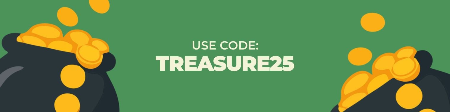 Use code Treasure25 for $25 off purchases of $55 or more. 25 coupons available. The discount code can only be applied ONCE per customer.